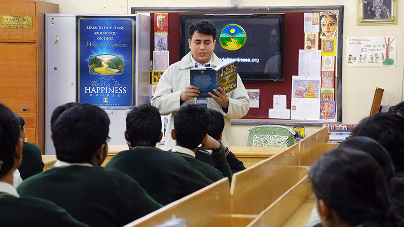 Rohit Sharma lê um preceito de O Caminho para a Felicidade aos alunos de uma sala de aula em Nova Deli.