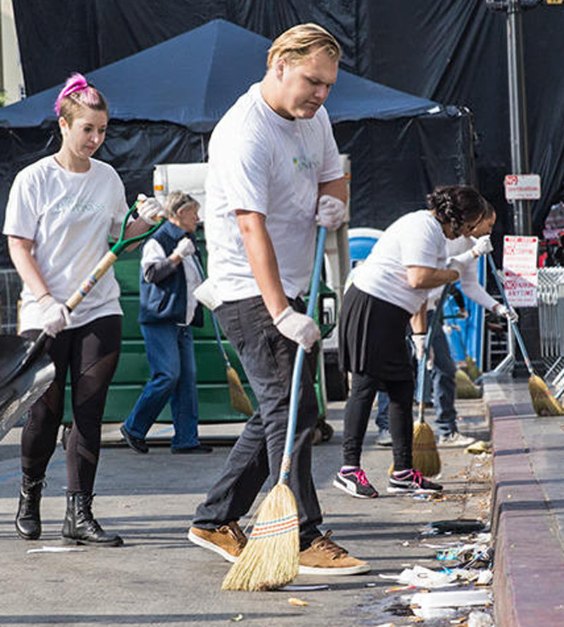 Um representante da Câmara Municipal da Cidade de Los Angeles reuniu o pessoal para começar oficialmente as atividades. Uma equipe de 30 pessoas foi às ruas vestindo camisetas de O Caminho para a Felicidade e encheram dezenas de sacos com a sujeira e os resíduos ao longo do percurso do desfile. Durante o desfile na noite seguinte, milhões de pessoas de todo o mundo viram Hollywood brilhar.